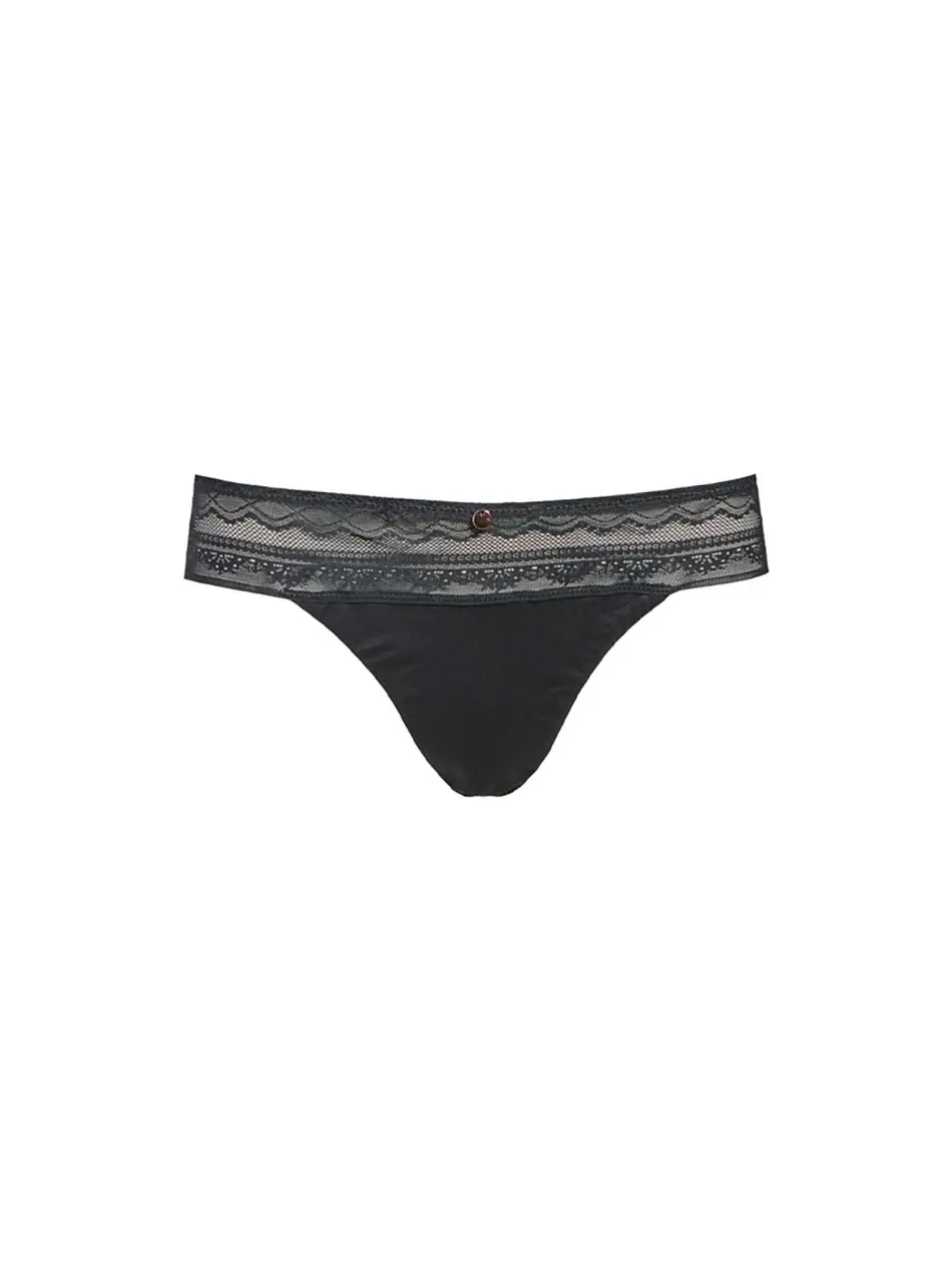 Der Tanga von Femilet verbindet ein blickdichtes Material mit Spitzendetails und einem Schmuckelement vorne.