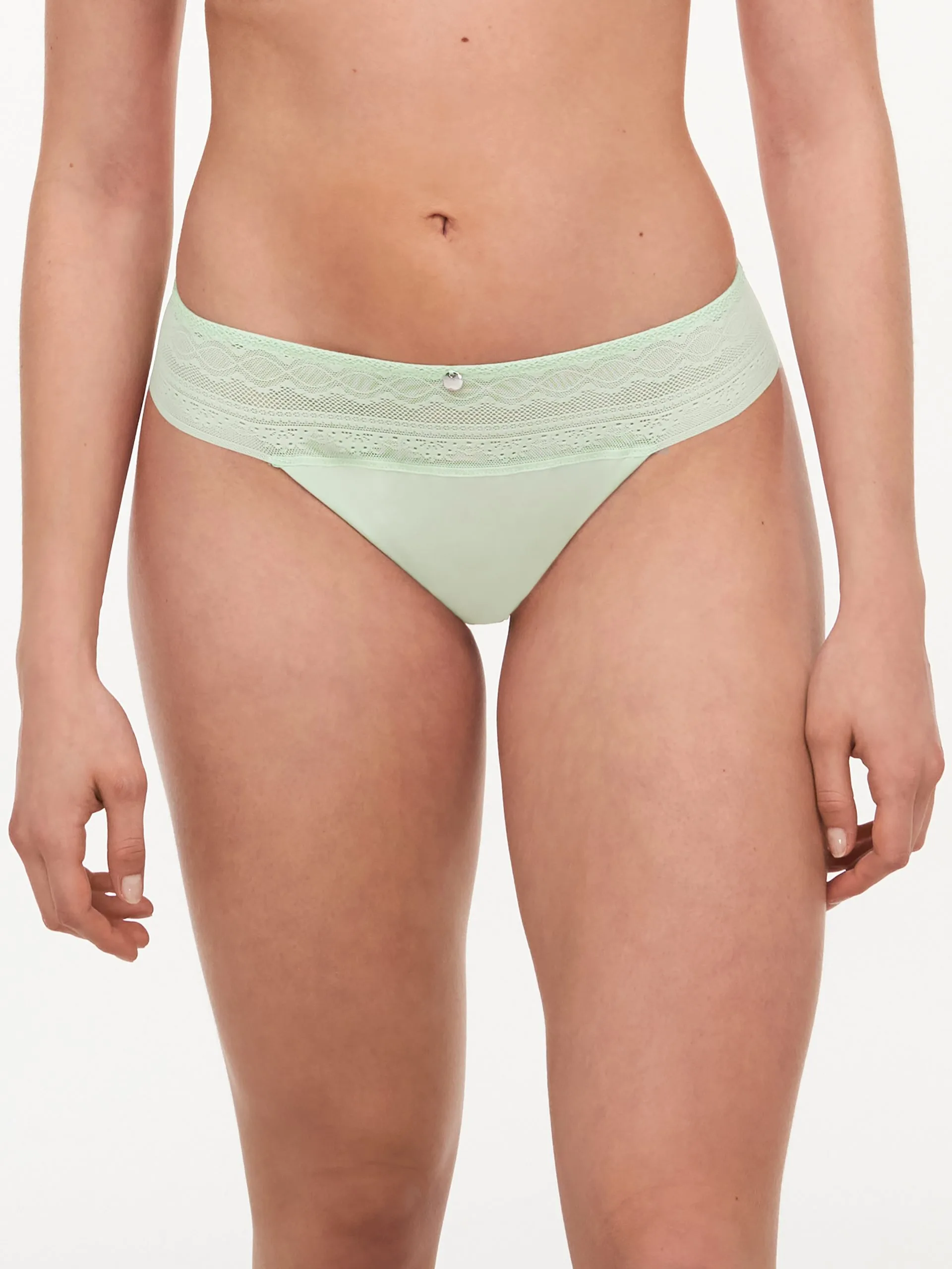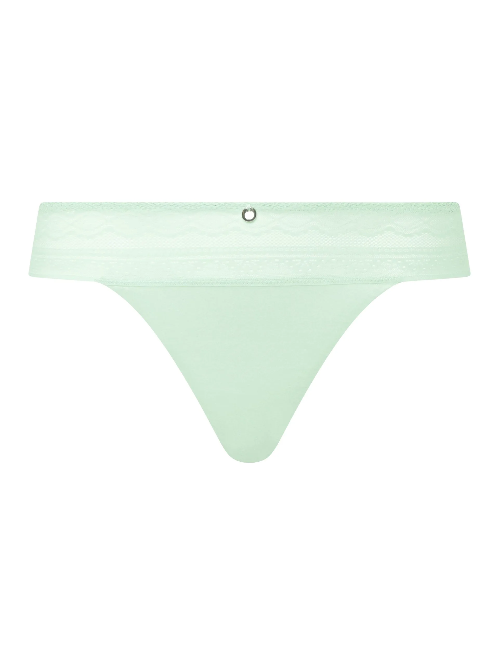 Der Tanga von Femilet verbindet ein blickdichtes Material mit Spitzendetails und einem Schmuckelement vorne.